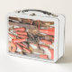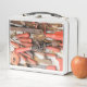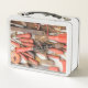 This is a standard metal lunchbox that appears to work just fine. We designed this box ourselves with an uploaded photo and custom text on the front and back. It looks absolutely beautiful except the front of the lunchbox is not centered like it shows in the photo. The print borders don't align with the inset flat part of the box where the preview photo online showed it perfectly centered in there. The back looks nice and centered though.