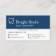 Keep your patients on schedule with this clean and professional dental office appointment reminder business card. Designed for dentists, hygienists, orthodontists, and family dentistry practices, this simple fill-in reminder card includes dedicated spaces for date, time, and visit notes—perfect for cleanings, exams, x-rays, follow-ups, and recalls. Dental-themed icons reinforce your branding, while your practice’s contact information stays visible and easy to reference. Wallet-friendly, customizable, and print-ready—ideal for reception desks, checkouts, and ongoing patient care reminders.