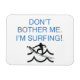 Hey, it's your time. Time to relax. Time to hit the waves running. Time to surf. Get the Don't Bother Me, I'm Surfing slogan on bumper stickers great for the car or surfboard, t-shirts great for that beach cover, or other gift for those days of surfing summer fun.