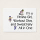 I'm a Fitness Girl, Workout Diva, and Sweat Fairy, All in One. Get the girl's triple play slogan for the health club woman who loves to be fit, workout, and be sweet despite the sweat. Cool. Fun. Hip. Just right for you!