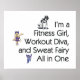I'm a Fitness Girl, Workout Diva, and Sweat Fairy, All in One. Get the girl's triple play slogan for the health club woman who loves to be fit, workout, and be sweet despite the sweat. Cool. Fun. Hip. Just right for you!