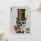 Here's a fun Halloween costume party invitation! The front features a grey skull wearing a bow tie and a formal top hat. At the skull's side is a rose bouquet. The orange text at the top, as well as the black text at the bottom right, may be easily customised by you. The images and text are placed on a light grey background. The back of the invite has the same grey background, more skulls, and your customised text in black.