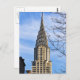 The top of New York City's iconic Chrysler Building against a blue sky with white clouds and bare tree branches