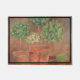Various topiary in terra cotta pots on top of books. Background is an antique brown.