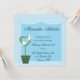 A pair of white doves sit on a green heart-shaped topiary in a large green pot against a sky blue background draped with with soft blue curtains on this sweet wedding invitation. All customisable text can easily be changed to suit your own needs. From my original digitally-created design.