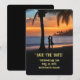 Save the date for a tropical island beach getaway, featuring a beautiful silhouetted palm tree and a charming couple.