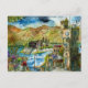 Postal of an original watercolor illustration that captures an old lakeside tower in an abandoned spa. The room is painted in warm, vibrant colors, creating the atmosphere of a dreamlike landscape that seems to be taken from a dreamy postcard. It is the perfect work for those who appreciate natural landscapes, traditional art, fantasy and places with history