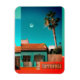 A colourful photo of a Spanish town with a traditional building, a crescent moon and a palm tree. Valencia, Alicante.