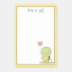 Cute cartoon tortoise holding a pink love heart balloon. He has a green head and legs, a yellow body, a brown shell and an adorable face. Next to him is a small happy yellow flower. The note to self can be used as it is or use the text box to add your own message.