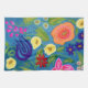Multi-coloured tossed flowers on a blue background add a whimsical, colourful detail to your kitchen. Painted in gouache and acrylic.