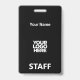 Easily personalise this Custom Administrative professional Name Badge without photo, with Scan Qr Code and large business logo. A simple business design in simple cool total black and white colours fully customisable in front and back sizes, sans-serif basic and modern fonts and a professional and clear look, perfect for small business employee, boss, guests. These business id badges supplies are avaiable with lanyard, metal clip or with retractable. No minimum order, but save money and enjoy Zazzle discounts by multiple orders!