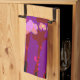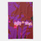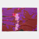 The abstract tapestry design by ZoeSPEAK on this Kitchen Towel began as Zoe’s original closeup photograph of bougainvillea flowers. The pink of the bracts has become terracotta and purple. The white flowers have become pink. The background is black, and there are blue violet, yellow and deep pink dots scattered across the shapes.
