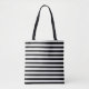 This cute stylish medium size tote bag is shown in a cute black and white stripes style.