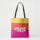 This cute stylish medium size tote bag is shown in magenta ,tangerine and yellow with a thin black stripe and handles in a striped colour block with the special text Vegas.