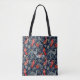 Tote Bag in a Folk Art design with animals and birds, plus a faded faux gold diamond look.  The colour of the bag is dark blue, red and white.