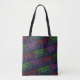 A colourful tote bag, with neon multicolor cassette pattern. Includes audio cassettes with pink, red, blue and green colours on the black background