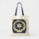Quilted yellow, white and dark blue "Star flower" pattern. The central "star" is a white with dark yellow ducks. This is surrounded by "petals" of dark blue with red, blue and yellow flowers. A second petal row is yellow and white gingham check, followed by the blue pattern again, with the corners in the yellow gingham.