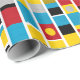 A design made up of stripes with hand painted bands, blocks and spots of colour in shades of of red, amber, deep gold, blue, grey black and white. Inspired by painted totems.
