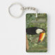 In a lush tropical rainforest, a vibrant toucan perches gracefully on a moss-covered tree branch, its striking, oversized beak contrasting brilliantly against the verdant foliage. The bird's iridescent plumage and intense gaze make for a captivating image, showcasing the beauty and exotic allure.