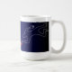 DANGER! Touching things on this desk may result in serious injury. Funny mug. One side has a warning sign, the other side has a body outlined in chalk touching the legendary 'red stapler' of office lore. The background colour gradients from a dark blue, to sidewalk crime-scene black.