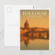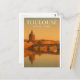 Vertical travel poster (2:3) of Toulouse — France, panoramic riverfront view of the Pont Neuf bridge over the Garonne River, with the brick dome of La Grave and warm terracotta architecture reflected on calm water at golden hour.