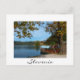 Postcard of traditional colourful tourist boats in Lake Bled under a chestnut tree in fall colours in an autumn landscape in Slovenia with a white border and the text: 'Slovenia'.