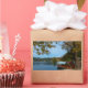 Rectangular photo sticker of traditional colourful tourist boats in Lake Bled under a chestnut tree in fall colours in an autumn landscape in Slovenia.