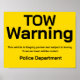 Bright yellow sign warning that a car, truck or other vehicle is illegally parked and subject to towing. This is set up so you can type in the number of the police department.