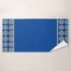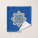 This Bath towel set, has gold and peach medallions on a blue background. They are made to coordinate with the matching Shower curtain and bath mat, This medallion is based on an actual ceramic tile. by Oregon tile maker Fay Jones Day