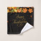 Black towel with warm autumn motifs – leaves, pumpkins, and golden hues.
