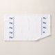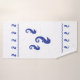 Sea horse graphic in blue. Three animals in middle of towel. Borders on all pieces show five seahorses in a row beneath scalloped wave pattern.