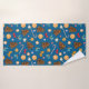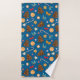 Towel with a New Year's pattern, cute pictures of candies, lollipops and gingerbread cookies, bows and leaves on a blue background.