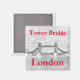 This fridge magnet features the London Tower Bridge, embossed black and white, as seen from the Thames River. The words "Tower Bridge" are in bright red above the bridge, and the word "London" is displayed, also in bright red script, toward the bottom of the magnet. Customize / personalize as you would like to. A nice gift for Christmas, birthdays , or as a British souvenir / keepsake of London in the UK.