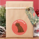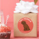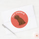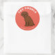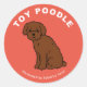 Sticker with an illustration of a brown Toy Poodle in teddy bear cut, sitting upon a pinkish red background.
