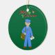 This ornament is decorated on one side with a toy Postman and the words "Merry Christmas" and on the other with a Christmas tree and the words "Merry Christmas."