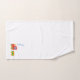 Colourful child's bath towel set featuring a red, blue, yellow and green toy train pattern. The wash cloth is done in a coordinating striped pattern and the hand towel is white with one train, in the corner and personalised with blue text.