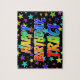 This vibrant and lively birthday-themed jigsaw puzzle design has the message "HAPPY BIRTHDAY, TRACI" with the characters having a colorful rainbow spectrum inspired gradient pattern, in addition to an exciting star field background pattern. An exciting puzzle like this might be used to send birthday wishes to somebody named Traci. [~Z0000468]