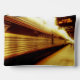 In the original photograph by ZoeSPEAK on this Accessory Pouch, passengers in the distance disembark from the train stopped on Track 2. Bright sunlight strikes the top of the shiny metal train, and a sign with the date and time can be seen hanging under the platform roof, with the rest of the train and platform in shadow. The artwork has been done in gold tones.