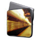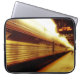 In the original photograph by ZoeSPEAK on this 15” Laptop Sleeve, passengers in the distance disembark from the train stopped on Track 2. Bright sunlight strikes the top of the shiny metal train, and a sign with the date and time can be seen hanging under the platform roof, with the rest of the train and platform in shadow.