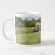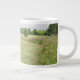 A photo of an old tractor in a field in rural France, cutting hay, on a farmer's sized jumbo mug. Photography by ruralfrance.