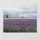 Postcard of a landscape with a traditional windmill and multiple modern windmills to generate green energy behind a field with purple hyacinth flower in the Bulb Region in Holland.