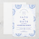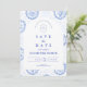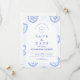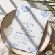 An elegant blue and white chinoiserie design inspired by classic Delft porcelain patterns. The intricate floral border surrounds a clean central panel, creating a refined and timeless look for sophisticated wedding celebrations. Delicate European toile-style artwork combined with crisp navy typography gives the design a heritage aesthetic reminiscent of fine porcelain and vintage stationery. Perfect for couples planning a classic blue and white wedding theme with traditional elegance.