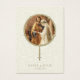 Featuring a beautiful traditional Catholic image of the image of the betrothal of Mary and Joseph inlaid in a gold rosary. A prayer is on the back for the bride and groom. All text and fonts can be modified.