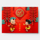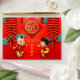 Festive traditional Chinese greeting with firecrackers, Lucky knots and auspicious clouds + golden Snake paper-cut + two cute children to wish Happy New Year. Design on red envelope as hong bao with the same design inside. Matching greeting card. holiday postcard and square sticker. Perfect for Chinese New Year of the Snake 2025.