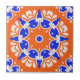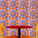Vibrant ceramic tile design featuring a seamless pattern made of geometric shapes in orange, blue and white.