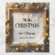A classic Christmas wine label featuring a gold stylised frame with ornaments and string lights and some snow.