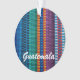 A traditional fabric weave pattern found in Guatemala. The design is bright and multicolored with red, blue, and yellow stripes. This is a photograph of fabric. Text is fully customisable. Remember your last trip to Latin America with this colourful piece.