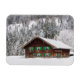 Rectangular photo magnet of a traditional wooden log cabin house with green shutters in a forest in the snow in winter in Bavaria at the border between Germany and Austria.