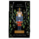 Original illustration of a classic nutcracker soldier with holly and mistletoe in the background. Editable text and background colour