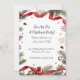 This traditional Christmas party invitation features an elegant red ribbon, greenery, and gold bells